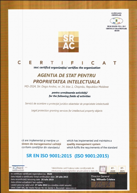 Certificatul ISO 9001:2015 garantează calitatea serviciilor prestate de AGEPI care pot să satisfacă cerințele și așteptările solicitanților.