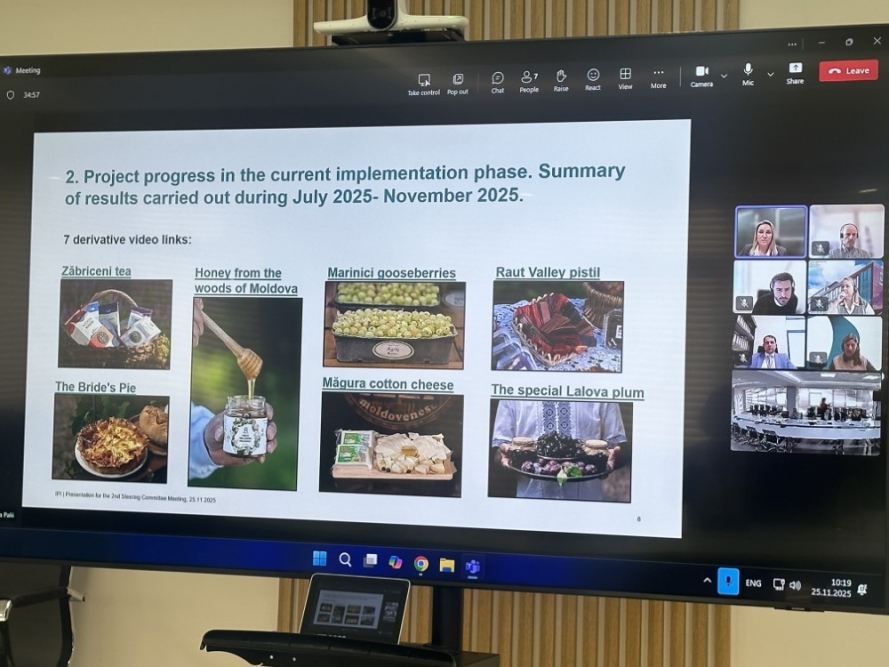 În cadrul ședinței, au fost prezentate progresele înregistrate în implementarea proiectului în perioada iulie – noiembrie 2025, inclusiv acțiuni ce țin de consolidarea cadrului normativ în domeniul indicațiilor geografice. Totodată, au fost raportate activități privind dezvoltarea materialelor de promovare pentru produsele protejate prin Indicație Geografică (IG), Denumire de Origine Protejată (DOP) și Specialitate Tradițională Garantată (STG). De asemenea, au fost trecute în revistă instruirile organizate cu suportul proiectului destinate mediului antreprenorial privind valorificarea proprietății intelectuale în procesul de dezvoltare a afacerilor dar și organelor de aplicare a legii și altor instituții publice.