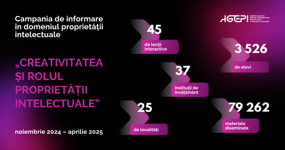 Agenția de Stat pentru Proprietatea Intelectuală (AGEPI), în parteneriat cu Ministerul Educației și Cercetării al Republicii Moldova, a încheiat cu succes Campania de informare în domeniul proprietății intelectuale cu genericul „Creativitatea și rolul proprietății intelectuale”, desfășurată în perioada noiembrie 2024 – aprilie 2025.