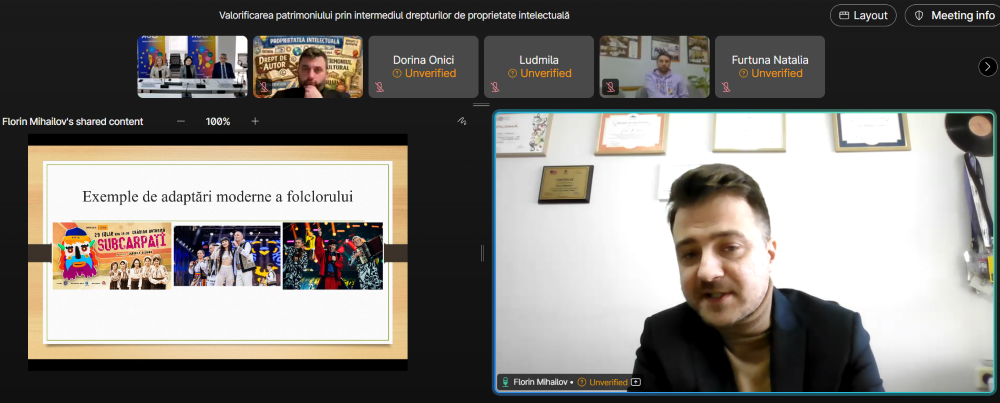 Sesiunea a evidențiat rolul drepturilor de proprietate intelectuală în protejarea și promovarea patrimoniului cultural, cu accent pe oportunitățile de valorificare a acestuia prin mecanisme moderne de protecție juridică. În cadrul reuniunii au fost abordate următoarele subiecte: Patrimoniul cultural și drepturile de autor – protecția creațiilor artistice și literare; Particularități practice de valorificare a drepturilor de autor. Folclor, patrimoniu și opere noi; Indicațiile geografice (IG) și specialitățile tradiționale garantate (STG) – simboluri de promovare și recunoaștere a produselor tradiționale și locale. Valorificarea patrimoniului imaterial prin intermediul mărcilor; Transformarea patrimoniului imaterial în branduri culturale, precum și studii de caz și bune practici din domeniu. Sesiunea s-a încheiat cu o rundă interactivă de întrebări și răspunsuri, participanții adresând întrebări vorbitorilor și inițiind un dialog constructiv pe marginea temelor discutate.