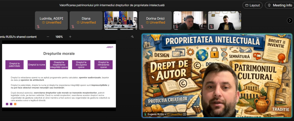 Prin organizarea unor asemenea sesiuni, AGEPI își propune să consolideze dialogul dintre comunitatea științifică, deținatorii de patrimoniu și experții în proprietate intelectuală, precum și să promoveze mecanismele juridice care contribuie la protecția, valorificarea și transmiterea sustenabilă a patrimoniului cultural.